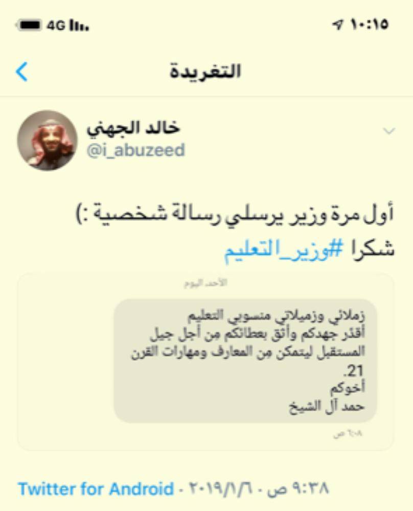وقال معلم آخر: «كلمات تدعو للتفاؤل وترمم شبه الثقة». فيما غرد المعلم خالد الجهني: «أول وزير يرسلي رسالة شخصية». وقال المعلم زيد الحسين: «نشكر الوزير آل الشيخ على هذا الدعم».