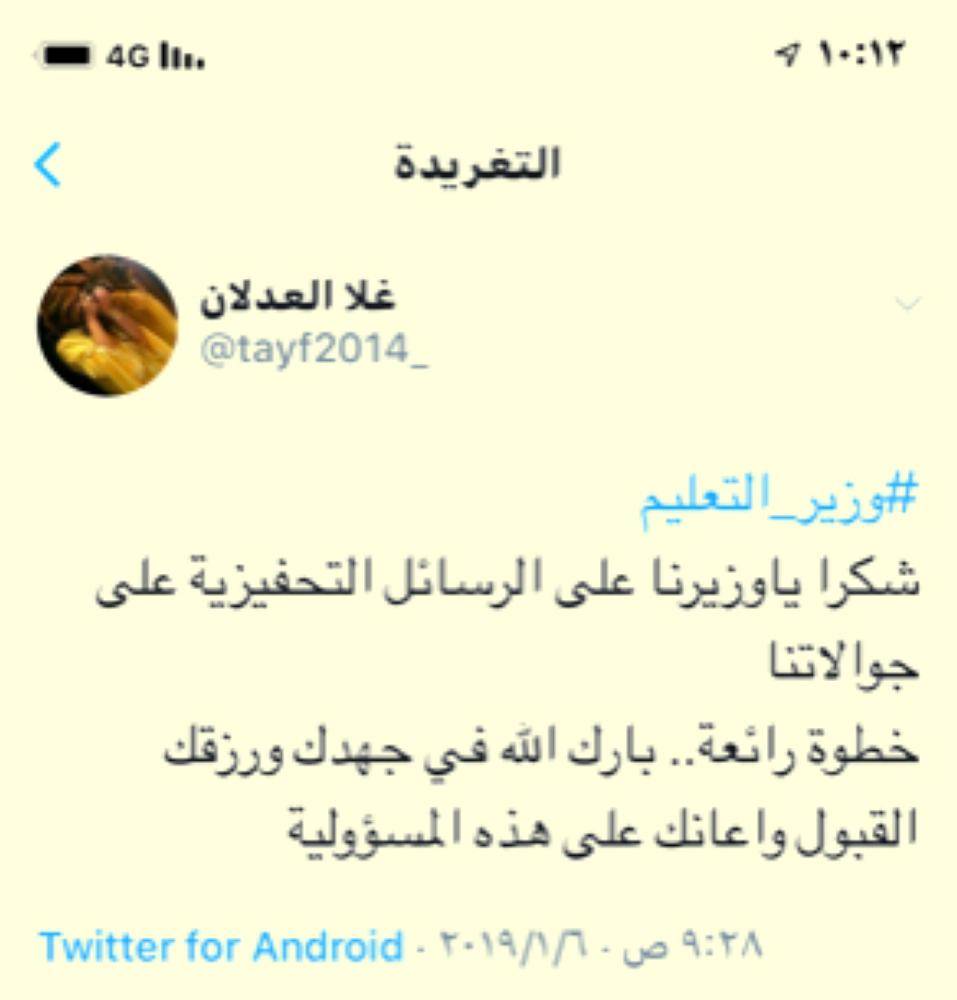 وأضافت المعلمة غلا العدلان: «شكرا يا وزيرنا على الرسائل التحفيزية وعلى جوالاتنا، خطوة رائعة بارك الله في جهدك ورزقك القبول وأعانك على هذه المسؤولية».