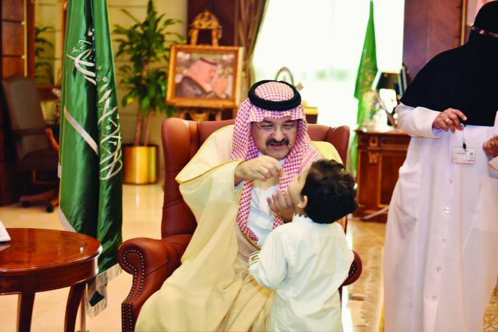 محافظ جدة يطعم طفلاً ضد مرض شلل الأطفال.