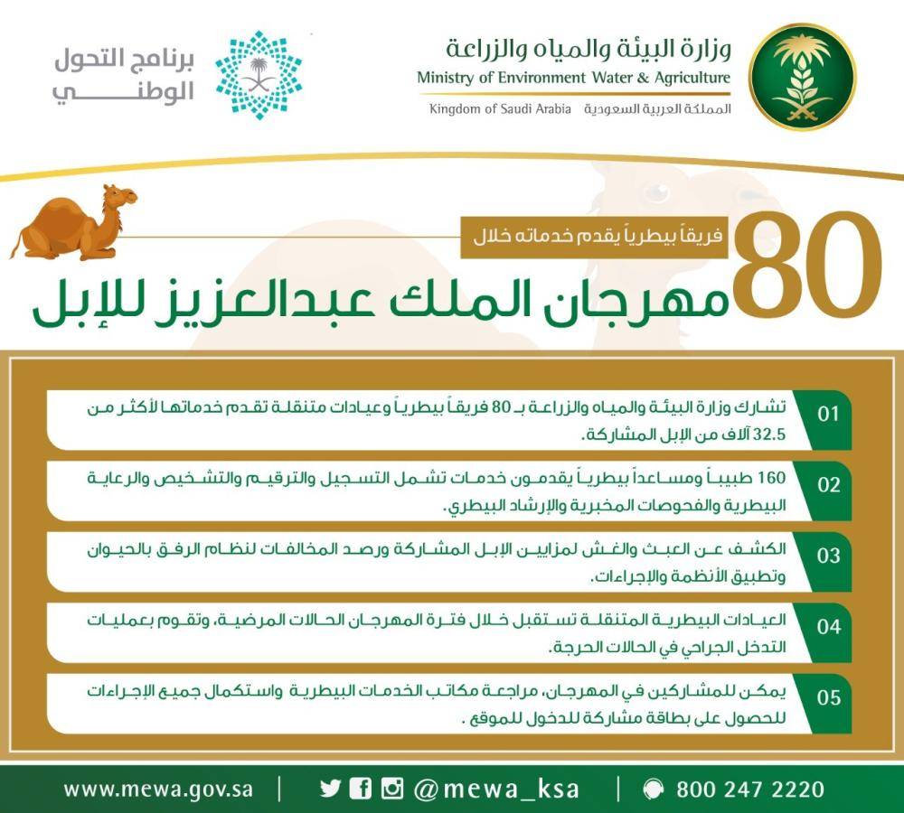 تشارك وزارة البيئة والمياه والزراعة، في مهرجان الملك عبدالعزيز لمزايين الإبل، والذي سينطلق (الثلاثاء ) القادم في الصياهد الجنوبية شمال شرقي العاصمة الرياض، بـ80 فريقاً بيطرياً وعيادات متنقلة تقدم خدماتها لأكثر من 32.5 آلاف من الإبل المشاركة قبيل انطلاق المهرجان، وخلال فعالياته التي ستستمر في الفترة من 5 فبراير وحتى 17 مارس، تحت إشراف مباشر من نادي الإبل الذي تم تأسيسه العام الماضي.