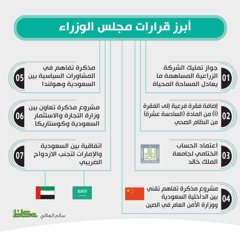 وأوضح وزير الإعلام تركي بن عبدالله الشبانة، أن مجلس الوزراء أصدر في ختام جلسته قرارات عدة شملت إضافة بند ـ يكون البند (ثالثاً) ـ إلى قراره رقم ( 691 ) وتاريخ 22 / 11 / 1438 بالنص الآتي: «يجوز لوزير البيئة والمياه والزراعة ـ وفقاً لما تقتضيه المصلحة العامة وبعد إجراء الرفع المساحي المشار إليه في البند (أولاً) من هذا القرار ـ تمليك الشركة الزراعية المساهمة (بحسب الإجراءات النظامية المتبعة) ما يعادل المساحة المحياة، وعلى الشركة أن تسلّم الوزارة المساحة الباقية من الأرض، ويصدر عليها صك باسم عقارات الدولة لمصلحة وزارة البيئة والمياه والزراعة، وللوزارة استغلالها أو الاستفادة منها بحسب الأنظمة والقرارات والتعليمات المعمول بها، وبناء على معايير تصدر بقرار من الوزير، ولا تضر بالمشاريع الزراعية للشركة».