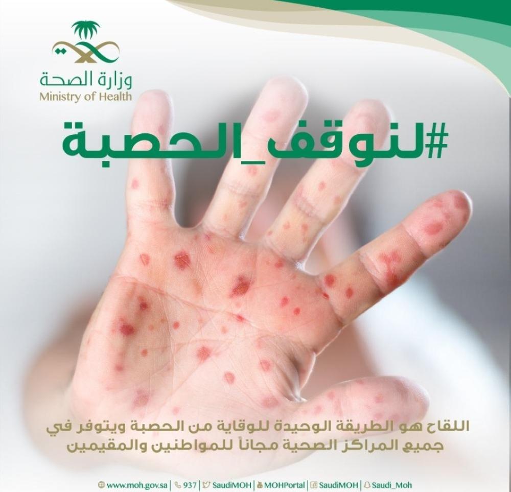 يذكر أن «الحصبة» مرض فيروسي شديد العدوى يصيب جميع الفئات العمرية، والأطفال غالباً، وقد يسبب حدوث مضاعفات شديدة الخطورة، ويطلق عليه مسميات أخرى، ومنها، بوحمرون، فيما تعد الحصبة الألمانية عدوى فيروسية حادة تبدأ أعراضها بالطفح الجلدي، وتورم الغدد اللمفاوية، وتتراوح فترة الأعراض ما بين 3-5 أيام.