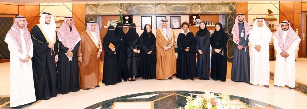 أمير الشرقية يتوسط أعضاء ومسؤولي لجان اللجنة العليا للفعالية النسائية «الكرة تجمعنا». (عكاظ)