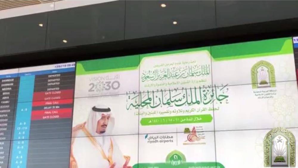 تزين مطار الملك خالد بالرياض بلوحات ترحيبية وشاشات تفاعلية للترحيب بالمشاركين في جائزة خادم الحرمين الشريفين الملك سلمان بن عبدالعزيز المحلية لتلاوة القرآن الكريم وحفظه وتجويده للبنين والبنات في دورتها الـ21 المنعقدة بالعاصمة الرياض في الـ11 من جمادى الآخرة، وتستمر 5 أيام، في إطار الجهود التي تقدمها وزارة الشؤون الإسلامية المشرفة على تنفيذ فعاليات المسابقة ممثلة بالأمانة العامة للمسابقة.