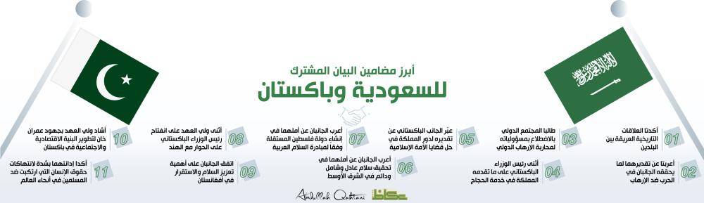 أكدت المملكة العربية السعودية وجمهورية باكستان الإسلامية في بيان مشترك في ختام زيارة ولي العهد نائب رئيس مجلس الوزراء وزير الدفاع الأمير محمد بن سلمان بن عبدالعزيز لباكستان العلاقات التاريخية العريقة بين البلدين، وجددتا التزامهما بمواصلة مكافحة التطرف والإرهاب، وأعربتا عن تقديرهما العميق لما يحققه الجانبان من إنجازات وتضحيات في الحرب ضد الإرهاب، مشيدتين بالشهداء الذين ضحوا بحياتهم من أجل التصدي لهذه الآفة الخطيرة، مطالبتين المجتمع الدولي بالاضطلاع بمسؤولياته حيال تضافر كافة الجهود الدولية لمحاربة الإرهاب الدولي. وشددتا على الحاجة إلى تجنب تسييس نظام التصنيف في الأمم المتحدة.