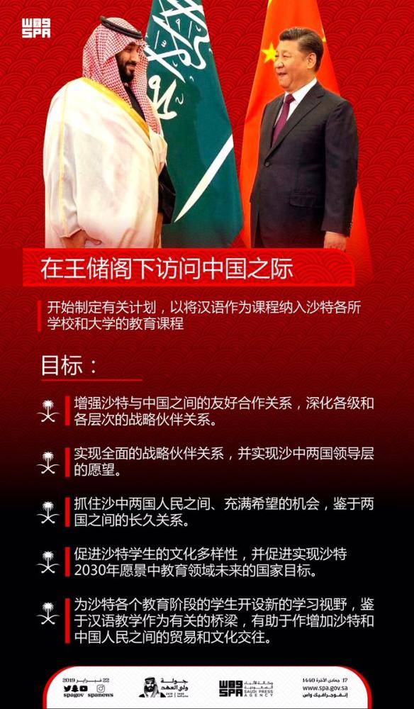 سعيًا لتعزير علاقات الصداقة والتعاون بين المملكة والصين، وتعميق الشراكة الإستراتيجية على كافة المستويات والأصعدة تم الاتفاق خلال زيارة ولي العهد نائب رئيس مجلس الوزراء وزير الدفاع الأمير محمد بن سلمان بن عبد العزيز، رئيس الجانب السعودي في اللجنة السعودية الصينية رفيعة المستوى في العاصمة الصينية بكين على البدء في وضع خطة لإدراج اللغة الصينية كمقرر دراسي على جميع المراحل التعليمية في مدارس والجامعات السعودية.