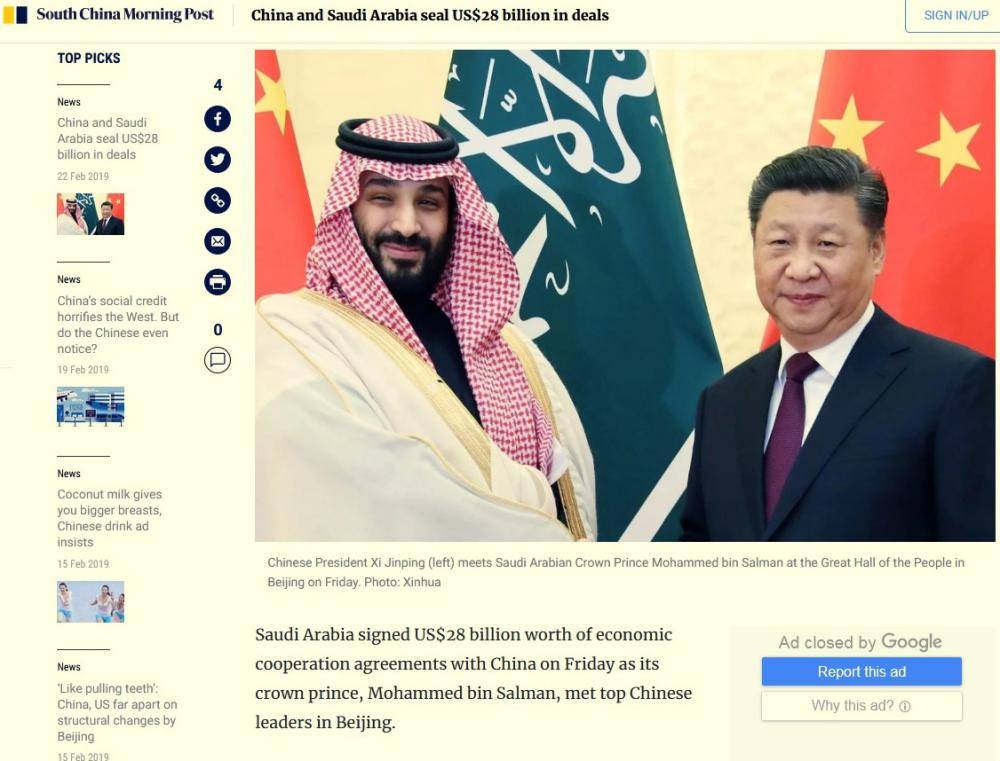 وأشارت صحيفة «ساوث تشاينا مورنينق بوست» إلى حديث الرئيس الصيني «شي جين بينغ» خلال لقائه ولي العهد في قاعة الشعب الكبرى في بكين حيث قال «الصين صديق جيد وشريك للسعودية».