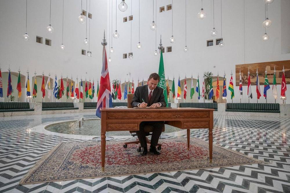 ولدى وصول الوزير البريطاني صافح كبار مسؤولي الوزارة ثم دوّن كلمته في سجل الزوار.