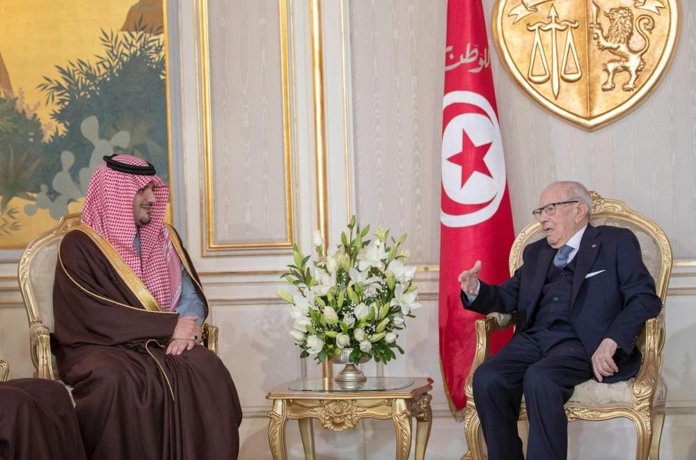 ونقل وزير الداخلية في بداية الاستقبال تحيات وتقدير خادم الحرمين الشريفين الملك سلمان بن عبدالعزيز آل سعود، والأمير محمد بن سلمان بن عبدالعزيز ولي العهد نائب رئيس مجلس الوزراء وزير الدفاع، للسبسي، وتمنياتهما لجمهورية تونس حكومة وشعباً دوام الرقي والتقدم والازدهار.
