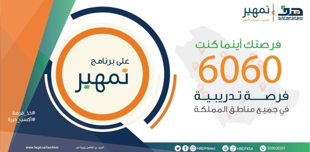 أكد صندوق تنمية الموارد البشرية «هدف»، توفر 6060 فرصة تدريبية على رأس العمل حالياً أمام المواطنين والمواطنات في جميع مناطق المملكة، وذلك عبر برنامج «تمهير»، من خلال زيارة الصفحة الالكترونية للبرنامج من خلال الرابط: http://taqat.sa/tamheer.