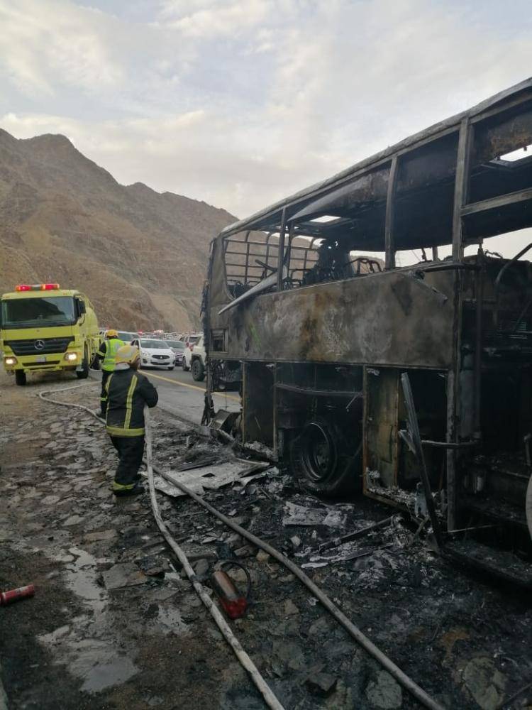 وتم إخلاء جميع الركاب وإخماد الحريق من قِبل فرق الدفاع المدني، فيما لم ينتج عن الحريق أي إصابات، وتم تسليم الموقع للجهة الأمنية المختصة لاستكمال الإجراءات اللازمة.احتراق حافلة تُقل 44 راكباً على طريق مربة