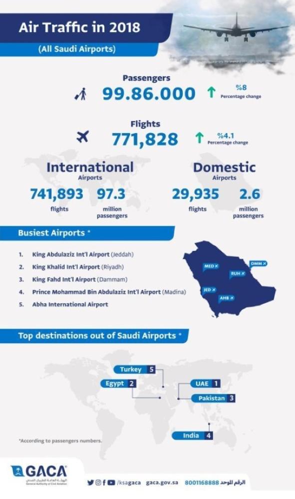 وسجلت الإحصاءات الرسمية التي أصدرتها الهيئة اليوم (السبت)، عن تجاوز أعداد المسافرين الذين عبروا المطارات السعودية خلال العام 2018م حاجز (99.86) مليون مسافر غادروا عبر (771,828) رحلة من مطارات المملكة الدولية والداخلية.
