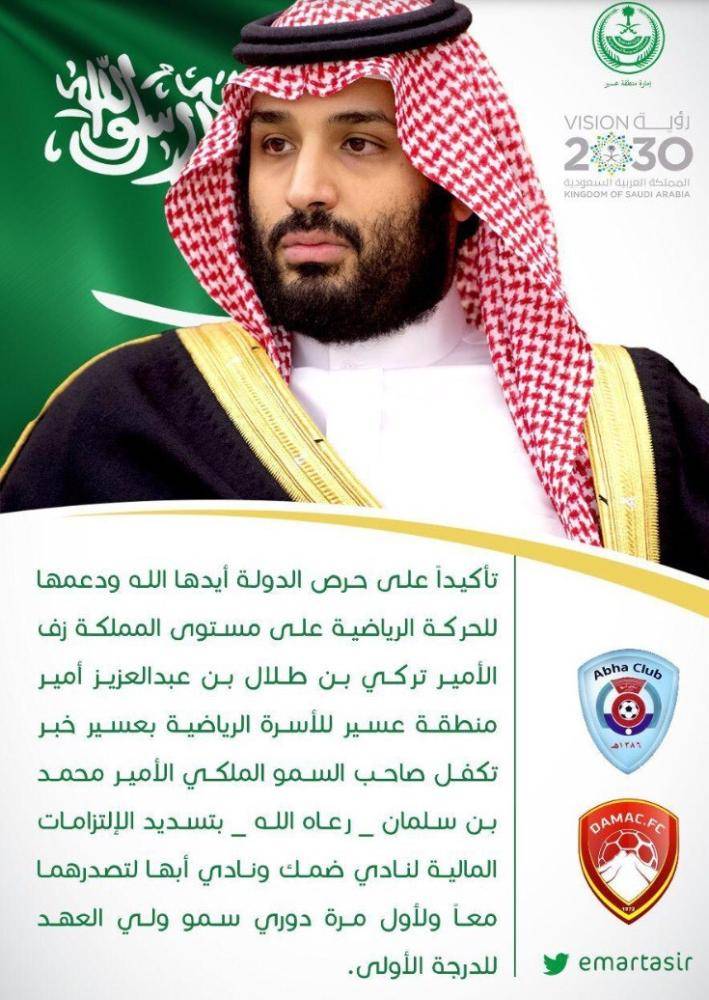 تأكيدا على حرص الدولة ودعمها للحركة الرياضية على مستوى المملكة، زف أمير منطقة عسير الأمير تركي بن طلال بن عبدالعزيز، للأسرة الرياضية بعسير خبر تكفل ولي العهد الأمير محمد بن سلمان، بتسديد الالتزامات المالية لنادي ضمك وأبها، لتصدرهما معاً دوري ولي العهد للدرجة الأولى.