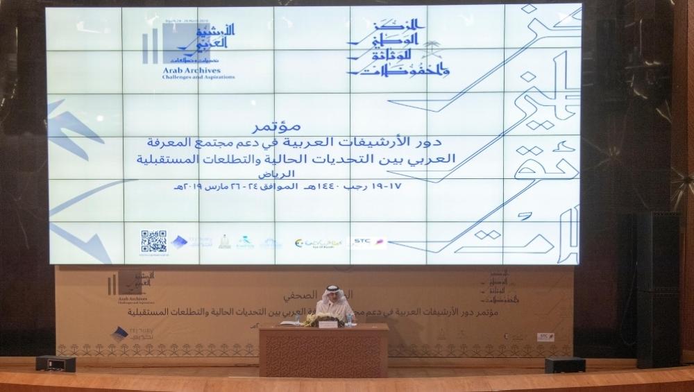 عقد المدير العام للمركز الوطني للوثائق والمحفوظات الدكتور فيصل التميمي مؤتمرًا صحفيًا امس ( الاربعاء ) بمقر مركز مؤتمرات وكالة الأنباء السعودية بالرياض سلّط من خلاله الضوء على تفاصيل المؤتمر الدولي للأرشيفات العربية الذي يقام تحت رعاية خادم الحرمين الشريفين بعنوان «دور الأرشيفات العربية في دعم مجتمع المعرفة العربي بين التحديات والتطلعات المستقبلية» في الفترة من 24 - 26 مارس الجاري وسط حضور محلي وإقليمي ودولي.