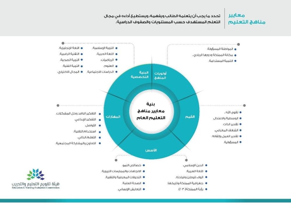 وتتضمن هذه المعايير (معايير المحتوى، ومعايير الأداء لمجالات التعلم العشرة) التي تعزز القيم وتبني المهارات وتراعي الأولويات الوطنية والأسس المنهجية، وتمثل وصفا لرحلة الطالب التعليمية عبر المستويات والصفوف الدراسية، وتسعى هذه المعايير إلى ترسيخ القيم الإسلامية والهوية الوطنية والعناية باللغة العربية، وإعداد الطلاب للحياة العامة، ووظائف المستقبل، كما تسعى إلى تحقيق أكثر من (19) هدفًا من أهداف رؤية المملكة 2030.