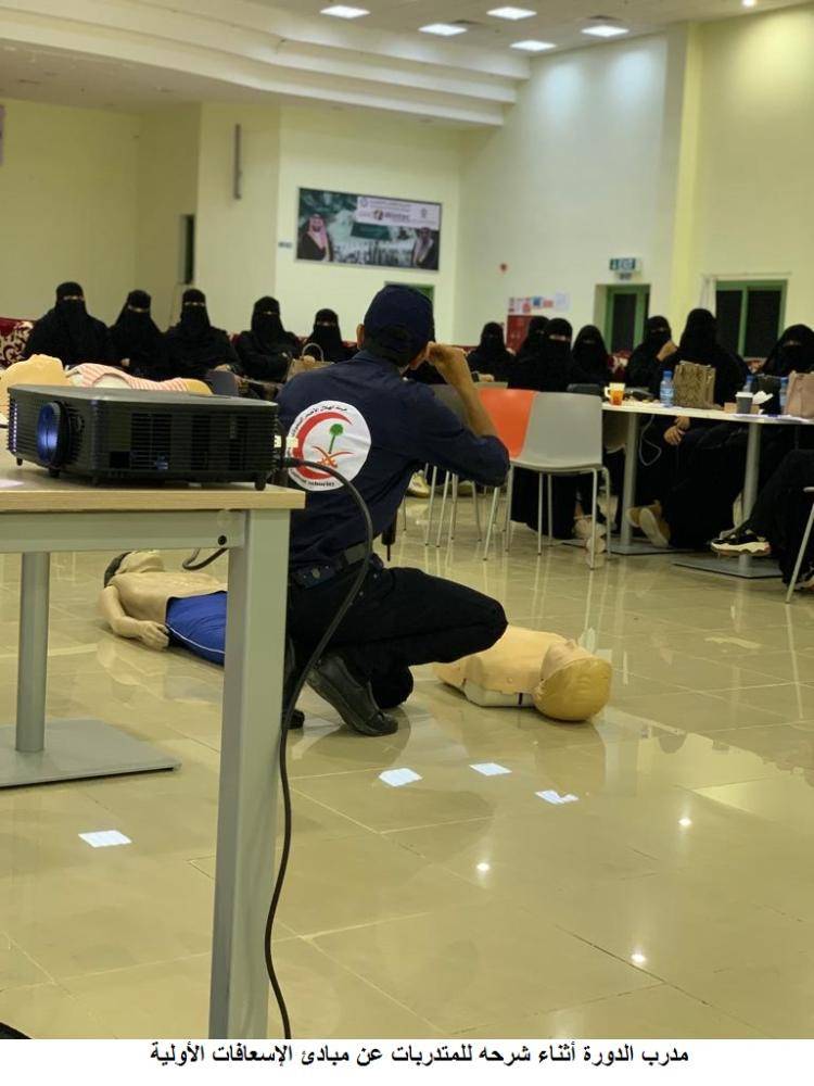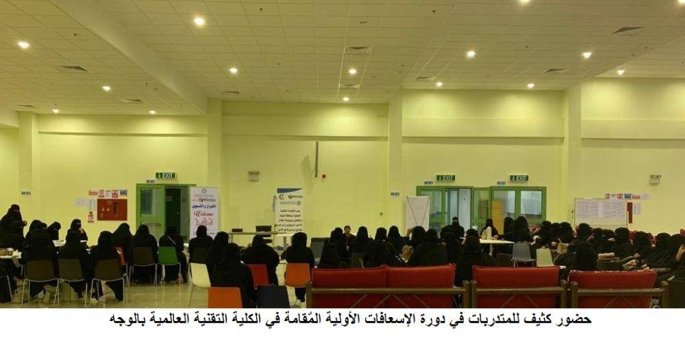 في إطار الشراكة المجتمعية بين مؤسسات الدولة، أقامت هيئة الهلال الأحمر السعودي بمنطقة تبوك ممثلة بإدارة التدريب، دورة توعوية عن مبادئ الإسعافات الأولية لطالبات الكلية التقنية العالمية بمحافظة الوجه.