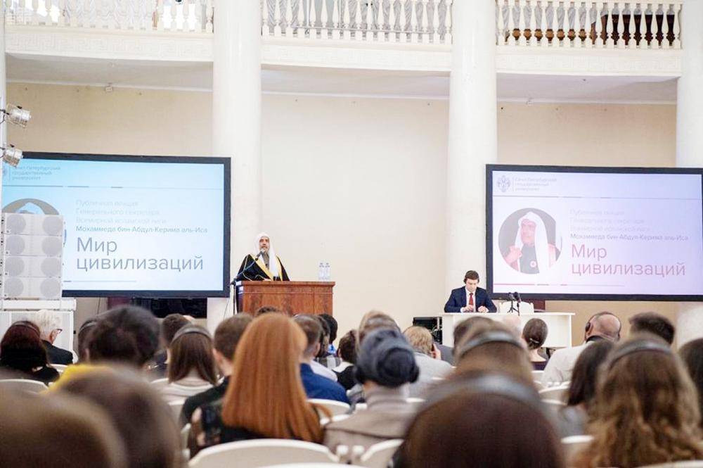 دعا الأمين العام لرابطة العالم الإسلامي الدكتور محمد بن عبدالكريم العيسى للتواصل الحضاري بين الأمم والشعوب بمختلف تنوعها، لتعزيز التقارب والتفاهم والتبادل لإزالة الحواجز السلبية والمفاهيم الخاطئة التي تجد بيئتها المناسبة في عدم الحوار أو عدم جديته أو عدم الأخذ بأسباب نجاحه، مؤكدًا كثرة المشتركات الإنسانية، وأن الحضارات تعتمد في بقائها حية قوية على القيم والعدالة والاستشراف الصحيح مع كفاءة الإدارة ومهارة التواصل واحترام مبادئ القانون المشترك وهو القانون الطبيعي. وأشار خلال محاضرة له في جامعة سانت بطرسبرغ الحكومية، بحضور مدير الجامعة البروفيسور نيقولا كروباتشيف وأعضاء هيئة التدريس ورئيس قسم الدراسات الشرقية وعدد من الأكاديميين والباحثين والطلاب، إلى أن اعتماد العدالة والقيم والانفتاح الإيجابي مع مهارة الاستشراف والتواصل من أسس القيادة نحو الريادة الحضارية، كما عد بناء الشخصية الوطنية برؤية مستنيرة ركيزة أساسية في الريادة والحسم لكثير من إشكالات الأمم والدول، وأن القيم الروحية كثيرا ما يكون تطبيقها شكلياً ومن الطبيعي أن يفتقد عندئذ الأثر السلوكي الملموس.