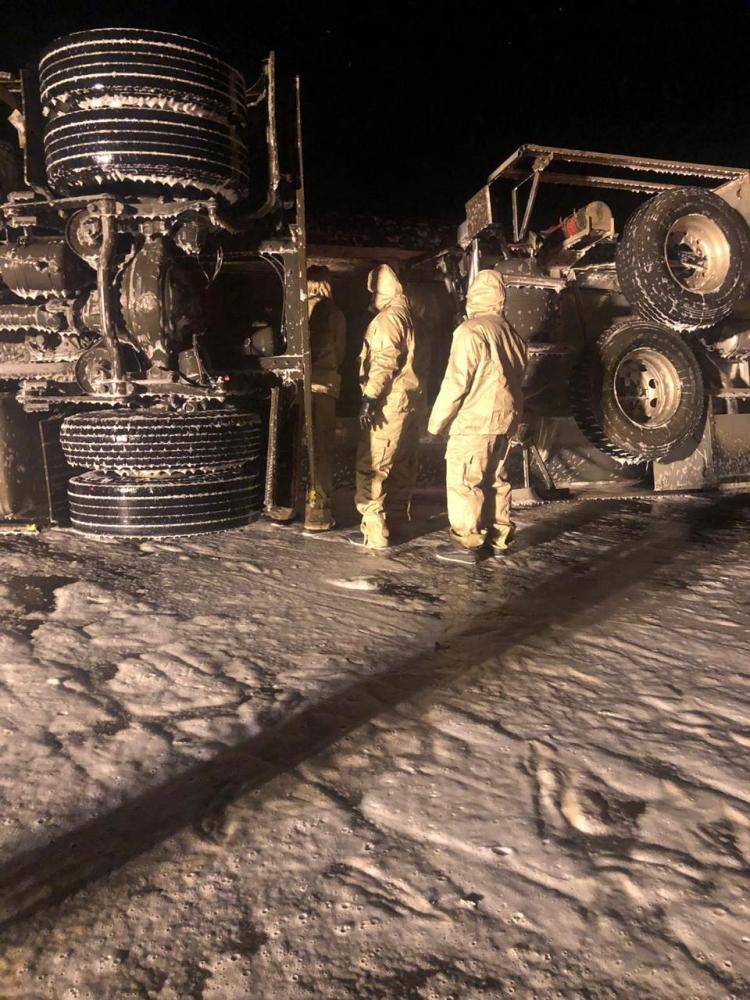 وأضاف: عند الوصول اتضح أن الحادثة عبارة عن انقلاب ناقلة وقود محملة بالديزل مع وجود تسرب للوقود على مسار الطريق دون حدوث حريق، وتم دعم الموقف بفرقة متخصصة بالمواد الخطرة من قوة طوارئ الدفاع المدني لعمل الإجراء اللازم، ومعالجة التسرب وتأمين ناقلة الوقود ومنع اشتعالها. كما أنه ولله الحمد لم ينتح عن الحادثة أي إصابات أو وفيات.