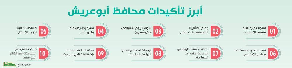 وعن الملاحظات التي تم رصدها خلال زيارته للمراكز الصحية، بين محافظ أبوعريش، أن بعضها يحتاج إلى صيانة وبالتالي تمت مخاطبة صحة المنطقة للعمل على صيانتها، ومعالجة احتياجاتها، إذ إن الخدمات الصحية لابد أن تتواكب مع ما تشهده المحافظة من كثافة سكانية بشكل متوال، كما أن تغيير مديري مستشفى أبوعريش العام بشكل متتال في فترة قصيرة يعكس اهتمام صحة المنطقة على اختيار الكفاءات الجيدة، مضيفا «التقيت بالمدير الحالي الأخصائي عمر الصافي وقدم لي شرحا مفصلا عما ستقوم به إدارته من تطوير وتحسين تتمثل في دعم كوادر وتوفير معدات طبية وذلك في سبيل خدمةالمرضى والمراجعين، وننتظر ذلك».