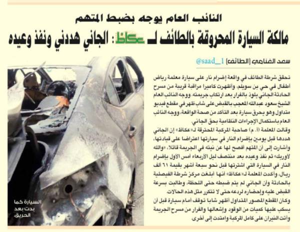 ضوئية لمتابعة «عكاظ» لحادثة إحراق سيارة المعلمة.