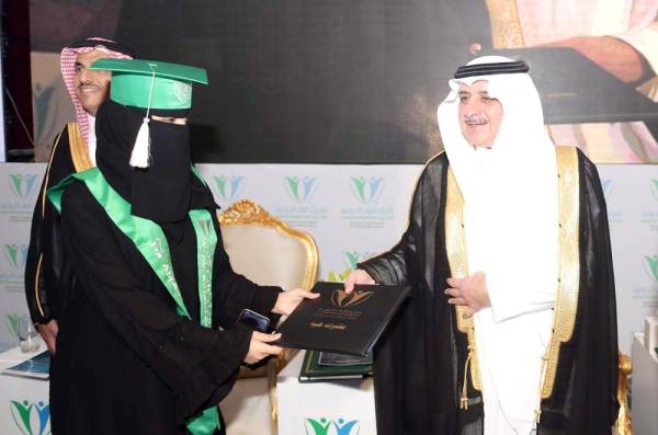 الأمير فهد بن سلطان يسلم شهادة التخرج لإحدى الطالبات. (عكاظ)