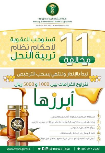 وأشارت الوزارة إلى أن العقوبات تشمل الإنذار والغرامة المالية بمبلغ 5 آلاف ريال، وفي حال تكرار المخالفة تضاعف الغرامة، وفي حال تكرارها للمرة الثالثة يتم إلغاء الترخيص وتصريح النحال.