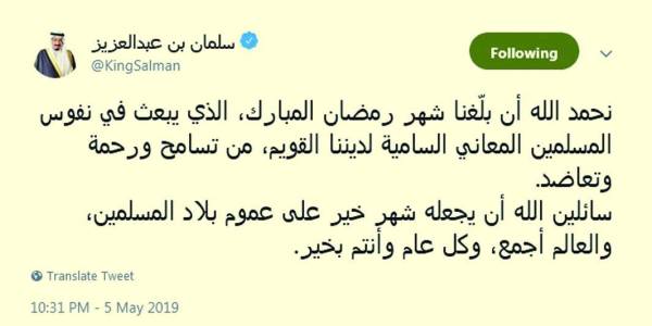 وقال الملك سلمان في تغريدته عبر حسابه في «تويتر» أمس (الأحد): «نحمد الله أن بلَّغنا شهر رمضان المبارك، الذي يبعث في نفوس المسلمين المعاني السامية لديننا القويم، من تسامح ورحمة وتعاضد».