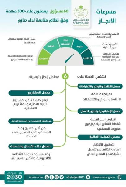 وانطلاقا من ضرورة توجيه دفة العمل في القطاع البلدي نحو تلبية احتياجات وتطلعات المستفيدين بحيث يكون المستفيد من الخدمات البلدية هو محور هذه الإصلاحات من خلال التحسين المستمر لعمليات التواصل والتفاعل مع المستفيدين والعمل على تطوير الخدمات البلدية والاستفادة من التقنيات الرقمية الحديثة، لما لها من دور كبير في تسهيل الحصول على خدمات مبتكرة ذات جودة عالية، قام الوزير بإطلاق «مسرعات القطاع البلدي» بمعامل رئيسية ومبادرات ذات مستهدفات قصيرة الأمد يتم تطبيقها على مستوى الوكالات والإدارات العامة بديوان الوزارة وكافة الأمانات، وذلك للاستفادة من أحدث ما توصلت إليه علوم التطوير الإداري من منهجية تسريع الإنجاز والتي تعمل على تعيز رضا المستفيدين من خلال: