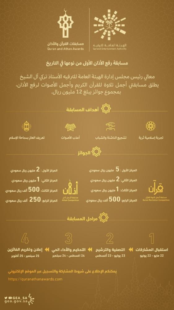 أطلق رئيس مجلس إدارة الهيئة العامة للترفيه تركي بن عبدالمحسن آل الشيخ أمس (الأربعاء)، مسابقتي أجمل تلاوة للقرآن الكريم وأجمل الأصوات في رفع الأذان، في المملكة العربية السعودية إلى عموم المسلمين بجميع أنحاء العالم بمجموع جوائز يبلغ 12 مليون ريال سعودي (3.2 مليون دولار)، وذلك ضمن إستراتيجية الهيئة التي أطلقها يناير الماضي.