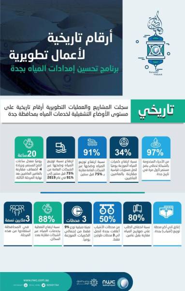 وأوضح رئيس القطاع الغربي بشركة المياه الوطنية المهندس محمد بن صالح الغامدي، أن الشركة بالقطاع الغربي استطاعت بعد اكتمال مشاريع تأهيل الشبكات والبنى التحتية وإعادة هندسة المنظومة التشغيلية بالكامل وتوزيعها بالتعاون مع شركاءها بقطاع المياه من القفز بكميات المياه الإجمالية التي يتم توزيعها حاليًا بشكل يومي بجدة بنسبة 34%، وذلك بعد اكتمال المرحلة الثالثة وتشغيلها مقارنة بما كان عليه الوضع قبل عامين عند بداية البرنامج، لتصل هذا العام إلى أكثر من مليون ونصف م3 يوميًا عبر الشبكات، تمثل ما يقارب 90% من كميات الطلب الإجمالي على المياه في محافظة جدة.
