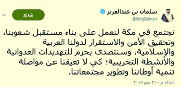 وجاءت تغريدة خادم الحرمين الشريفين قبيل وقت قصير من انطلاق الدورة الرابعة عشرة لمؤتمر القمة الإسلامية في مكة المكرمة. واستضافت مكة قمتين طارئتين واحدة عربية وأخرى خليجية (الخميس)، لمواجهة التحديات والتهديدات التي يواجهها الشرق الأوسط، وأبرزها التدخلات الإيرانية في شؤون دول المنطقة. واختتمت القمتان الطارئتان ببيانين ينددان بتصرفات إيران المزعزعة لاستقرار المنطقة وأمنها.