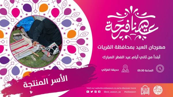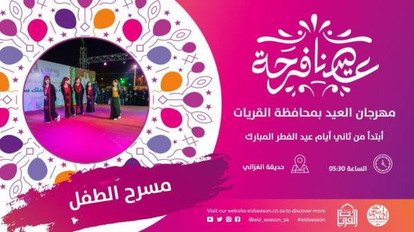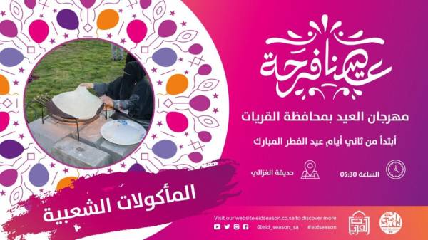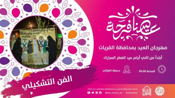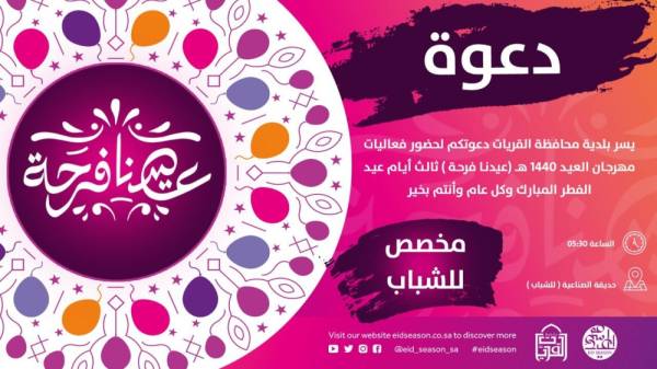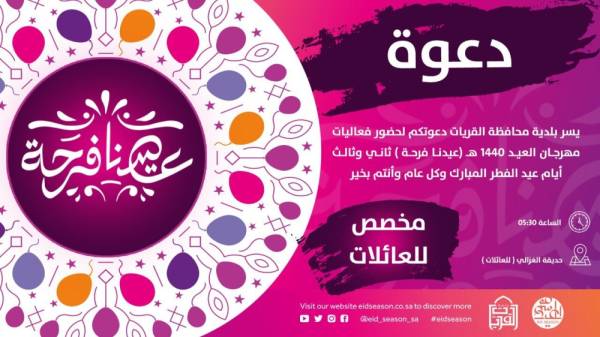 وجهت بلدية محافظة القريات دعوتها للأهالي والشباب لحضور فعاليات مهرجان عيد الفطر المبارك لعام 1440 التي تنطلق بشعار «عيدنا فرحة» والمقام بحديقتي حي الغزالي، وحديقة الصناعية ثاني وثالث أيام العيد من الساعة 5:30 مساءً وحتى 11:00 مساء.