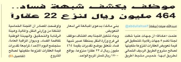 وكانت «عكاظ» نشرت خلال شهر شعبان الماضي خبر تشكيل لجنة تضم 5 جهات رقابية شكلت من جهات عليا، للتقصي حول وجود مبالغة في تقدير قيمة تعويض العقارات المنزوعة ملكيتها لصالح مشروع الطريق الرديف الشمالي لطريق أبها - خميس مشيط (طريق بني مالك) المرحلة الأولى في مدينة أبها. وجاء تشكيل اللجنة بعد اكتشاف موظف في فرع وزارة النقل بمنطقة عسير شبهة فساد تتعلق بوضع تقديرات عالية لأسعار 22 عقارا منزوعة لصالح المشروع وتقدر مساحتها بنحو 1700 ريال للمتر المربع الواحد، بقيمة تعويضية تبلغ 464 مليون ريال تقريبا. ووقفت اللجنة ميدانياً على المشروع لمعاينة العقارات منزوعة الملكية للمشروع، إضافة إلى زيارة فرع كتابة العدل بمدينة أبها للتحقق من صكوك العقارات، ومعرفة القيمة التقديرية لأسعار العقارات في منطقة المشروع.