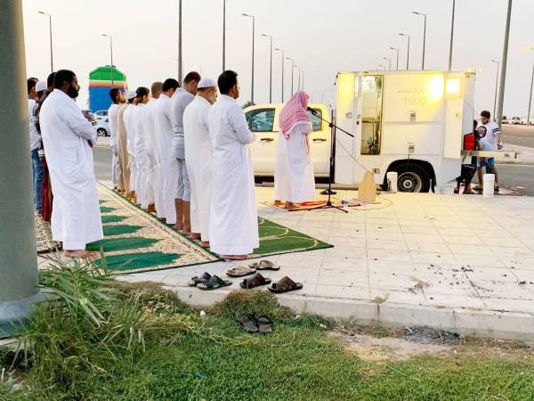 متنزهون يؤدون الصلاة في مصلى متنقل بالكورنيش.
