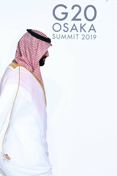 Saudi Crown Prince Mohammed bin Salman arrives for the family photo during the G20 Osaka Summit in Osaka on June 28, 2019. / AFP / Brendan SMIALOWSKI