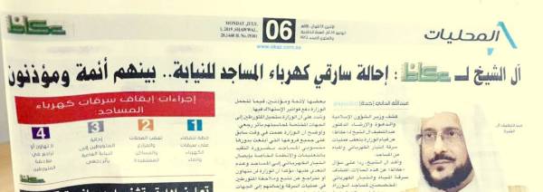 يذكر أن وزير الشؤون الإسلامية الدكتور عبداللطيف آل الشيخ كشف لـ«عكاظ» إحالة أئمة ومؤذنين سرقوا كهرباء مساجد للنيابة العامة.