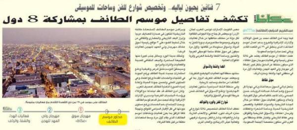 وكانت «عكاظ» قد تميّزت بنشر تفاصيل فعاليات الموسم، الذي سينطلق من خلال ثلاثة محاور؛ وهي مهرجان سوق عكاظ، ومهرجان ولي العهد للهجن، ومنتزه الردّف والهدا والشفا؛ للتعريف بالمساجد التاريخية والمواقع الاثرية. وسيشعل لياليه 7 فنانين، وسيشهد لأول مرة ساحات مفتوحة لتعليم الزوار الموسيقى العربية، وشوارع للفن والورد والفواكه التي تتميّز بها الطائف، ومشروع محور النور الذي تعكف الأمانة على تنفيذه هذه الأيام.