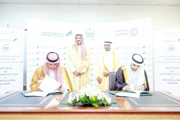 شهد أمير منطقة المدينة المنورة رئيس لجنة الحج بالمنطقة الأمير فيصل بن سلمان توقيع اتفاقية بين برنامج خدمة ضيوف الرحمن ومدينة المعرفة الاقتصادية، بحضور وزير الحج والعمرة الدكتور محمد بن صالح بنتن.