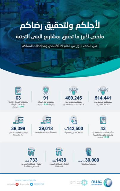 أنهت شركة المياه الوطنية تنفيذ 91 مشروعًا مائيًا وبيئيًا خلال النصف الأول من العام الجاري في مناطق المملكة المختلف بتكلفة بلغت 3.2 مليار ريال. ويأتي تنفيذ هذه المشاريع لخدمة قرابة مليون مستفيد إضافي في جميع أنحاء المملكة، إضافة إلى سعيها لتحقيق أهداف مبادرات برنامج التحوَّل الوطني ورؤية المملكة 2030، الرامية إلى رفع نسب التغطية بالخدمات المائية والبيئية لمناطق المملكة كافة وفق أفضل المعايير في هذا المجال، وذلك انسجامًا مع توجيهات خادم الحرمين الشريفين، وولي عهده.