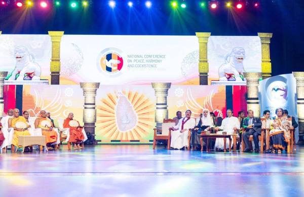 الرئيس السيريلانكي وبجواره الشيخ محمد العيسي والقيادات الدينية في منصة الجلسة الافتتاحية للقمة.