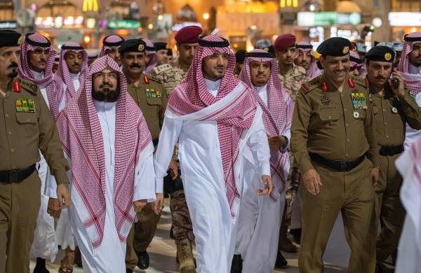 تابع وزير الداخلية رئيس لجنة الحج العليا الأمير عبدالعزيز بن سعود بن نايف بن عبدالعزيز، إجراءات تنفيذ خطة أمن الحج في ساحات المسجد الحرام وبواباته الرئيسية، وذلك خلال جولة تفقدية قام بها مساء أمس (الأحد).