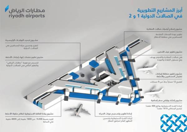 كما أنهت «مطارات الرياض» عدد من المشاريع منها إنشاء بوابتي سفر إضافية في طابق المغادرة بالصالة الدولية رقم (2) لتصبح 10 بوابات، لزيادة القدرة الاستيعابية بواقع (486) مقعداً لتكون إجمالي سعة الصالة (1616) مقعداً، ومشروع زيادة الطاقة الاستيعابية لنظام مناولة الأمتعة في الصالتين الدوليتين (1-2) لرحلات القدوم بنسبة 300% (من 1600 حقيبة في الساعة إلى 4800 حقيبة في الساعة)، بالإضافة إلى تطوير منطقة إجراءات تفتيش الركاب المغادرين والأمتعة المصاحبة لهم في الصالتين الدوليتين (1-2)، لتصبح 12 مساراً بدلاً من 9 مسارات مما ساهم في تسريع إجراءات التفتيش، وانسيابية دخولهم لمنطقة بوابات المغادرة.