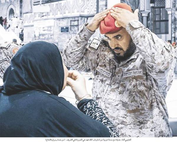 أكد خالد بن ماضي العتيبي (أحد منسوبي الشرطة العسكرية بالقوات المسلحة الملكية السعودية)، الذي تداولت مواقع التواصل الاجتماعي أمس صورتة أثناء حديثه مع مسنة عربية من أمام باب الملك فهد في الحرم المكي الشريف، أن ما يقدمه وزملاؤه وكافة أبناء الشعب السعودي لضيوف البيت الحرام يأتي تنفيذا لتوجيهات القيادة الحكيمة، وعلى رأسها خادم الحرمين الشريفين الملك سلمان بن عبدالعزيز، وولي العهد الأمير محمد بن سلمان، وكافة المسؤولين.