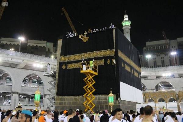 وتم استبدال كسوة الكعبة المشرفة القديمة بكسوة جديدة، بإشراف ومتابعة الرئيس العام لشؤون المسجد الحرام والمسجد النبوي الشيخ الدكتور عبدالرحمن بن عبدالعزيز السديس.