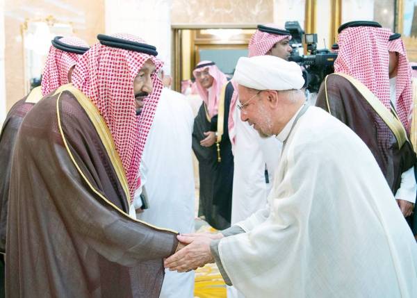 وقال الملك سلمان خلال حفل الاستقبال السنوي الذي أقامه في الديوان الملكي بقصر منى أمس (الإثنين)، لقادة الدول الإسلامية، وكبار الشخصيات الإسلامية، وضيوف خادم الحرمين الشريفين، وضيوف الجهات الحكومية، ورؤساء الوفود ومكاتب شؤون الحجاج الذين أدوا فريضة الحج هذا العام: «الحمدُ لله رب العالمين القائل في كتابه الكريم (وأذن في الناس بالحج يأتوك رجالاً وعلى كل ضامرٍ يأتين من كل فج عميق)، والصلاة والسلام على نبينا محمد، وعلى آله وصحبه أجمعين، أحييكم من جوار بيت الله العتيق، من مهبط الوحي ومنبع الرسالة المحمدية الداعية إلى التسامح والتحاور، وأهنئكم بعيد الأضحى المبارك يوم الحج الأكبر، أعاده الله على الجميع بالخير والبركات».