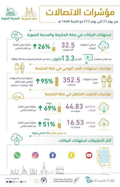 وأوضح محافظ هيئة الاتصالات وتقنية المعلومات أن سرعة التنزيل للإنترنت المتنقل في مكة المكرمة بلغت 44.83 ميجابت/ثانية بنسبة زيادة بلغت 69% مقارنةً بالعام الماضي، فيما وصلت سرعة التنزيل للإنترنت المتنقل في المدينة المنورة 48.14 ميجابت/ثانية بنسبة زيادة 54% مقارنةً بالعام الماضي، وذلك نتيجة لتوفر البنية التحتية المتطورة لشبكات الاتصالات وزيادة سعاته، بالإضافة إلى زيادة في مجموع النطاقات الترددية المخصصة لتقديم خدمات الاتصالات بنسبة 140%.