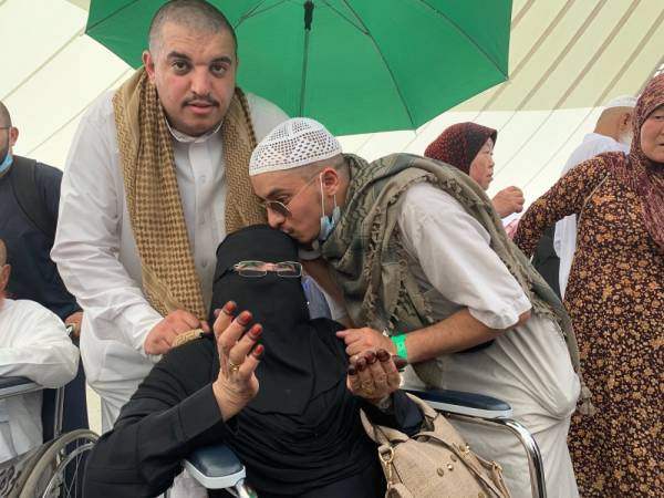 الحاجة أم راكان سبعينية يتنافس أبناؤها على دفع عربتها لرمي الجمرات، وهي ترفع كفيها بالدعاء، فيما يقبل ابنها رأسها ينافسه الآخر بقبلة أخرى في مشاهد عفوية رصدتها عدسة «عكاظ» في الجمرات أمس.