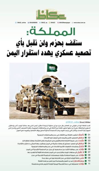 أكدت المملكة أنها لن تتوانى عن التعامل بكل حزم مع أي محاولة لزعزعة استقرار اليمن الذي يعد بمثابة تهديد لأمن واستقرار السعودية والمنطقة، معربة عن أسفها لنشوب الفتنة بين الأشقاء في عدن والمحافظات الجنوبية، رافضة التصعيد الأخير والمسار الذي اتجهت إليه الأحداث، والآثار التي ترتبت عليها، وعدم الاستجابة لندائها السابق بوقف التصعيد والتوجه نحو الحوار.