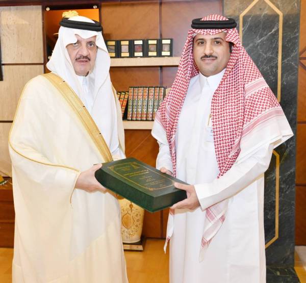 الأمير سعود بن نايف متسلما نسخة من رسالة الماجستير لأحد منسوبي الإمارة. (عكاظ)