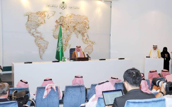 الجبير متحدثاِ في المؤتمر الصحفي. (عكاظ)